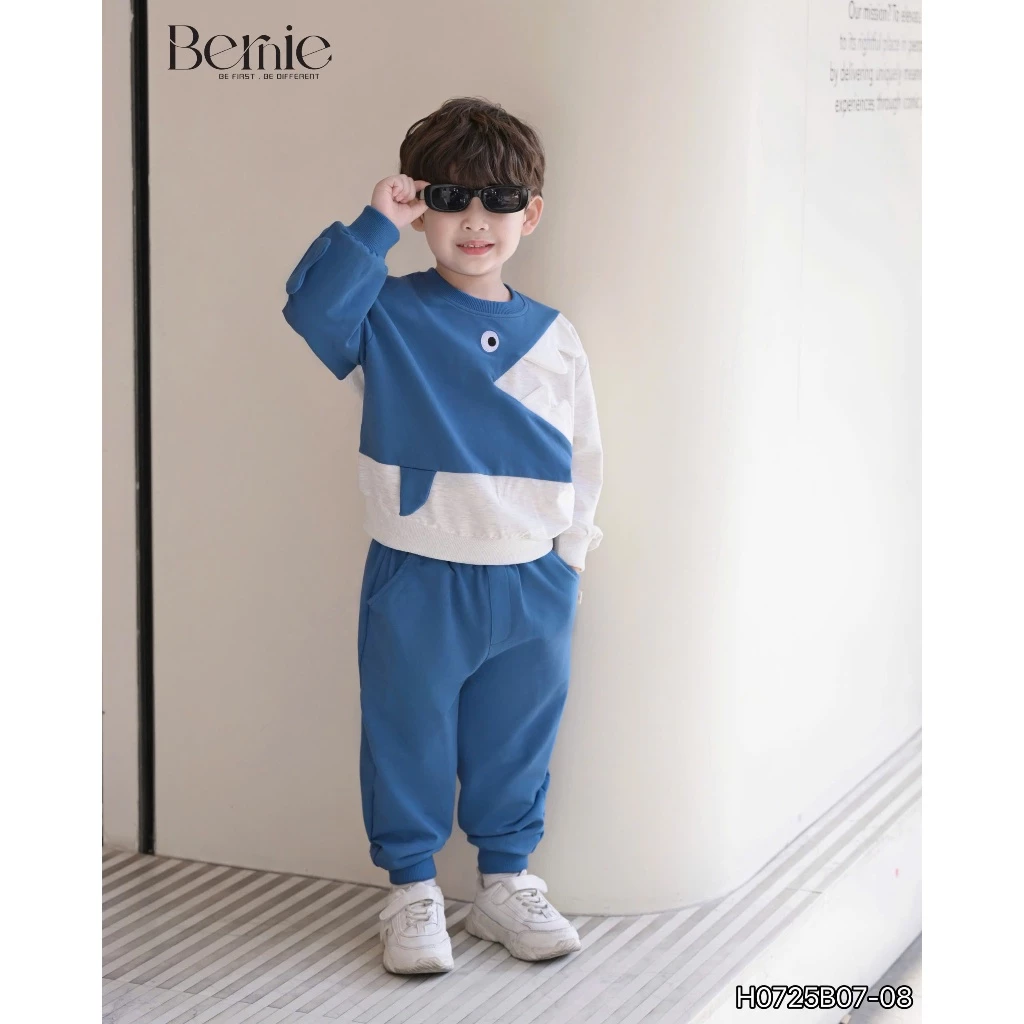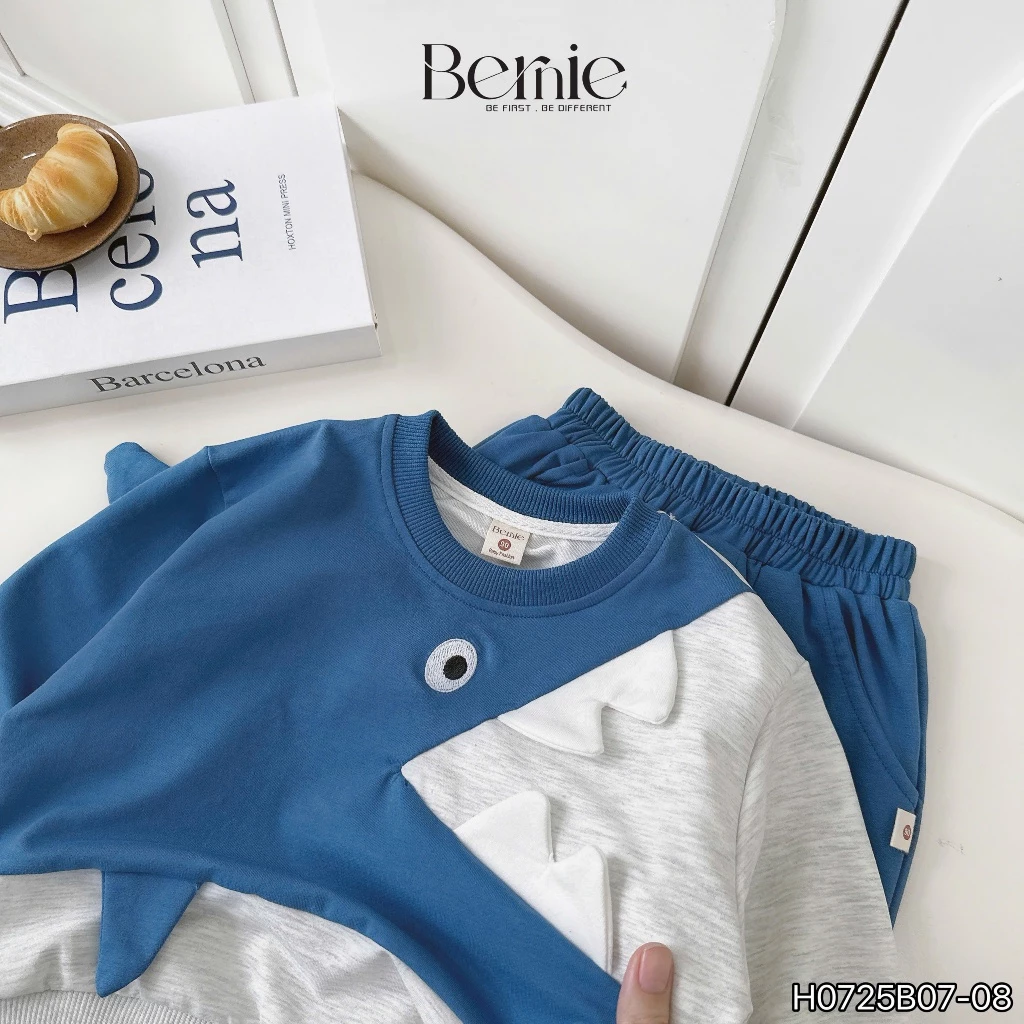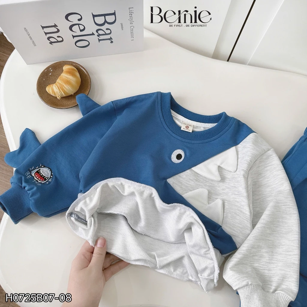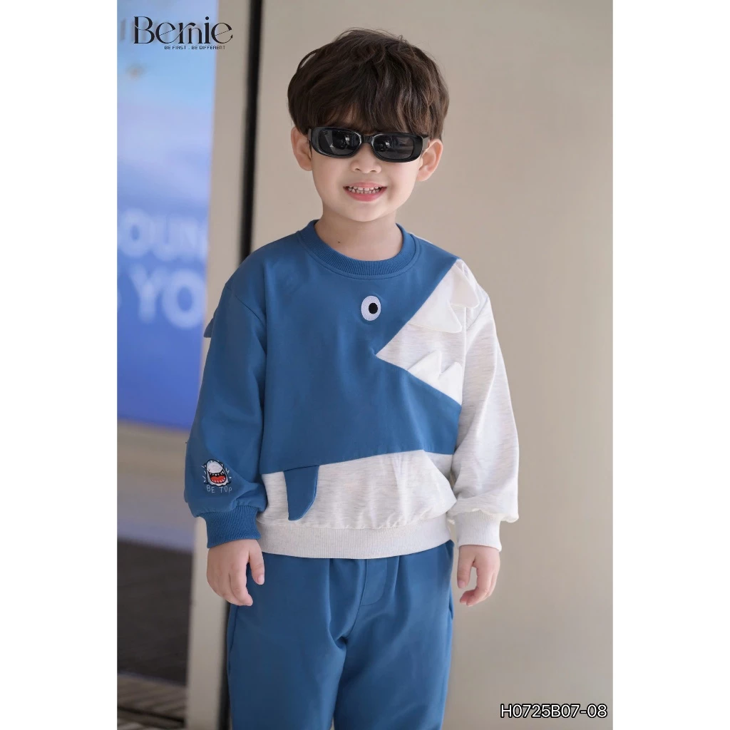 Bộ thu đông nỉ Bernie bé trai họa tiết cá mập màu xanh